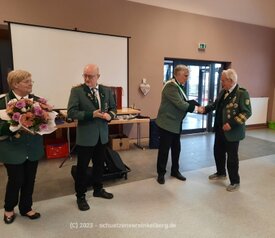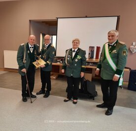 Am Sonntag 22.01.23 fand der Familientag der Kelberger Schützen statt. Ein Vortrag von Jürgen Schäfer beleuchtete die Geschichte der Bruderschaft vor dem Hintergrund der allgemeinen geschichtlichen Entwicklung. Passend zu der Reflexion der letzten Jahrzehnte, besonders auch des sozialen u. gesellschaftlichen Engagements der Bruderschaft, wurden einige Ehrungen vorgenommen. Brudermeisterin Marga Kinner und der Bezirksbundesmeister Norbert Steffens begannen mit Vinzenz Theisen u. Erich Bouhs. Beide stehen seit 65 Jahren im Dienst der Schützen. Heinz Theisen wurde für 60 und Walter Steffens für 50 Jahre geehrt. Ursula Hagerhoff ist seit 40 Jahren Mitglied. Marga Kinner kann auf 25 Jahre zurückblicken. Tobias Theisen 15 Jahre und Sebastian Theisen 10 Jahre. Als ganz besonderes Dankeschön erhielten, als „Dienstälteste“ Schützen, Heinrich Braun, Josef Zimmer u. Vinzenz Theisen eine Schiefertafel mit dem Bildnis des Hl. Sebastianus in Bronze.